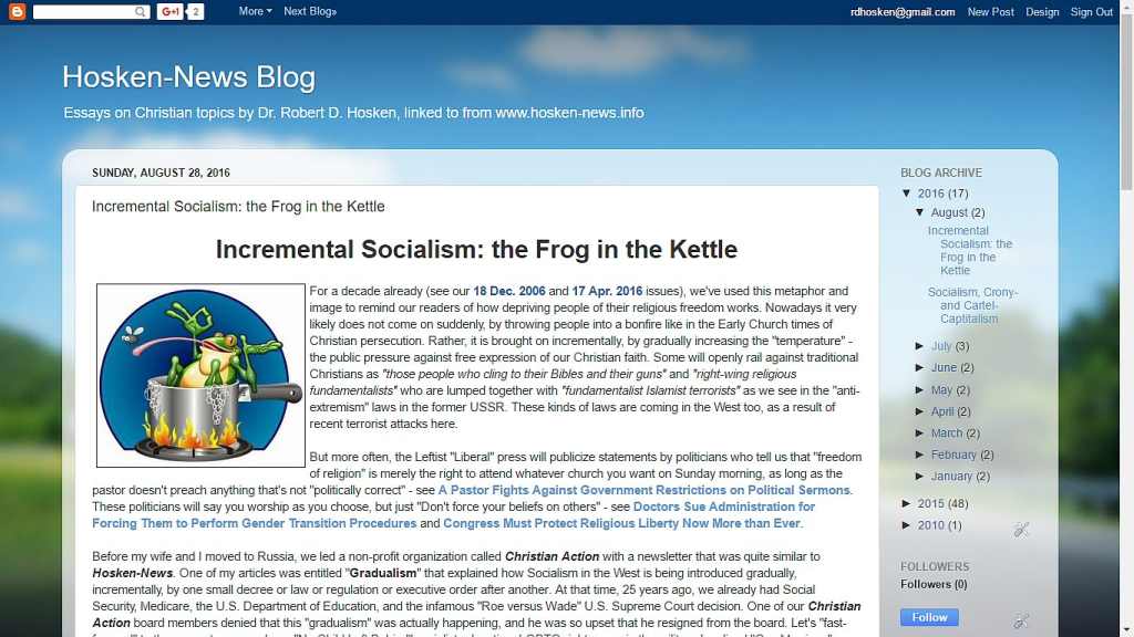 ![]() Aug. 28, 2016 - Incremental Socialism: the Frog in the Kettle |