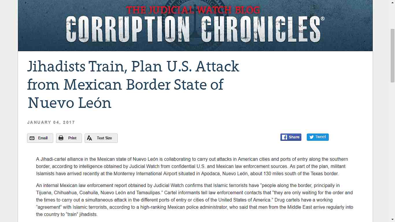 ![]() Jan. 08, 2017 - Jihadists Train, Plan U.S. Attack from Mexican Border State of Nuevo Leon |